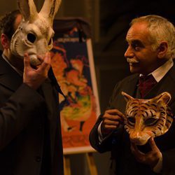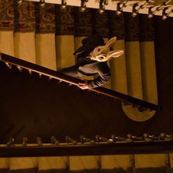Un hombre disfrazado con una máscara de conejo subiendo las escaleras del Gran Hotel