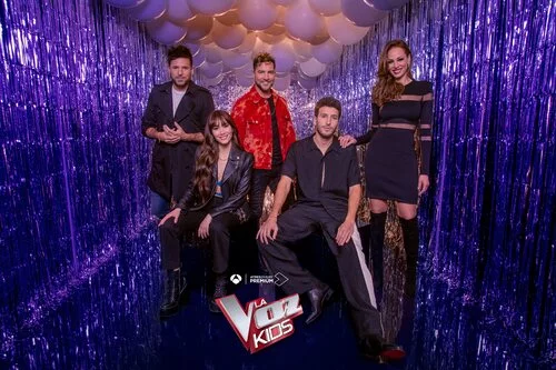Eva González, Aitana Ocaña, Sebastián Yatra, David Bisbal y Pablo López posan para uno de los carteles de 'La Voz Kids 7', el concurso musical producido por Boomerang TV.