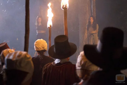 Ingrid (Rachel Boston) y Freya (Jenna Dewan-Tatum) Beauchamp atadas en la hoguera en 'Las brujas de East End'.