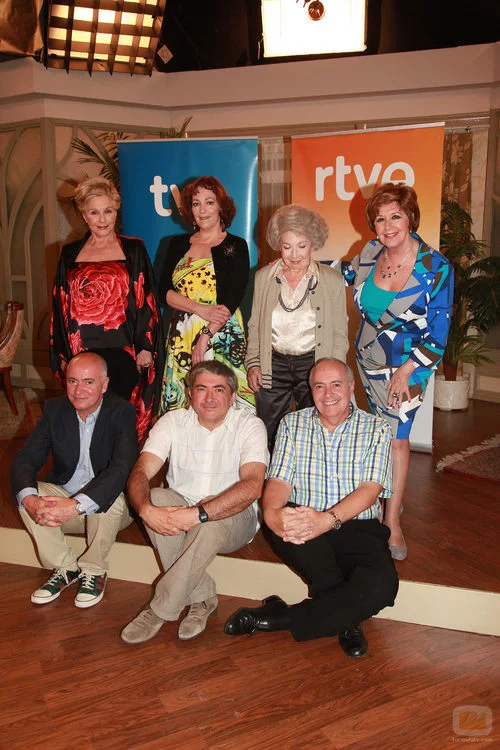 Las actrices de 'Las chicas de oro' junto con el productor José Luis Moreno, Juan Luis Iborra y Fernando López Puig, responsable de ficción de TVE.