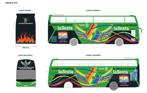 Autobús de laSexta que desfilará durante el World Pride Madrid 2017. El bus se ve desde los dos laterales y por delante y detrás.