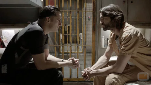 Reverte interpretado por Asier Etxeandia y Daniel Ochoa interpretado por Aítor Luna en una escena de la serie 'La fuga'.