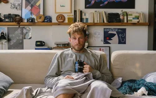 Álvaro Cervantes, actor que da vida a Adri, sujeta una taza mientras está sentado en el sofá en la TV movie de Netflix.