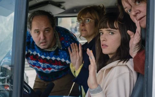 El personaje de Carla (Susana Abaitua) levanta las manos dentro de un vehículo junto a parte del reparto de la TV movie de Netflix.