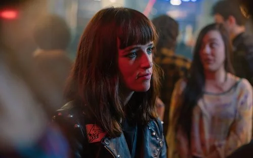 Carla, personaje interpretada por Susana Abaitua, dirige su mirada hacia delante en mitad de una fiesta durante el rodaje de la ficción de Netflix.