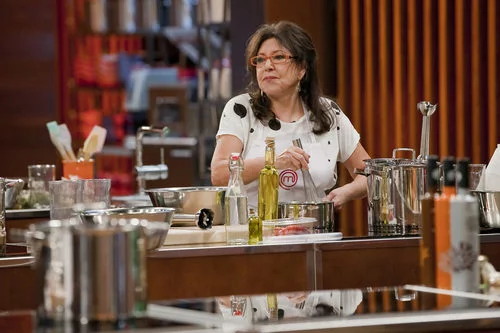 Loles León, una de las cuatro finalistas de la primera edición de 'MasterChef Celebrity' en España, cocina en las instalaciones del programa.
