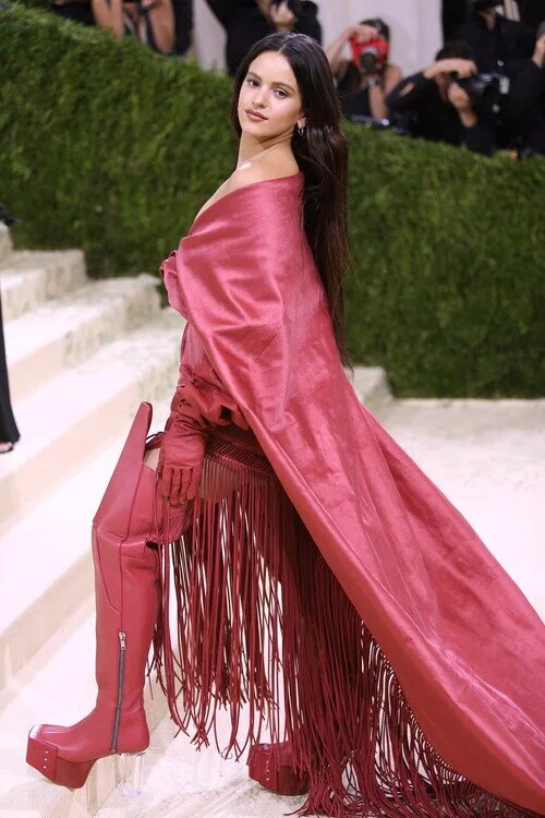 La cantante Rosalía llega a la Gala MET 2021 con un vestido rojo que emula la estética de los tradicionales mantones de manila andaluces.