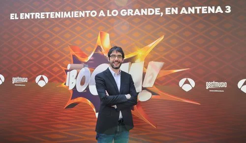 El presentador de televisión Juanra Bonet posa durante la rueda de prensa de '¡Boom!' celebrada debido a que Los Lobos ganaron el bote del programa.
