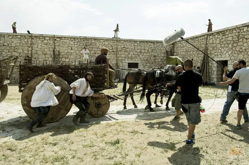 Los actores se meten en sus respectivos personajes para rodar una escena en el exterior donde se esconden detrás de un carro de caballos.