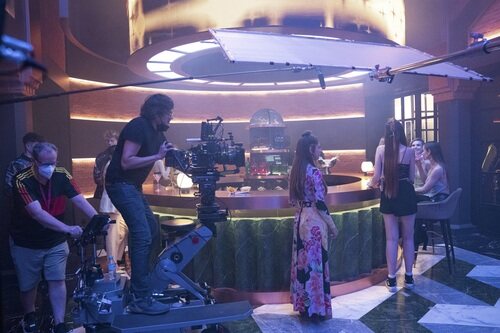 Detrás de cámaras de una secuencia de una fiesta durante el rodaje de la sexta tanda de 'Élite', ficción de Netflix.