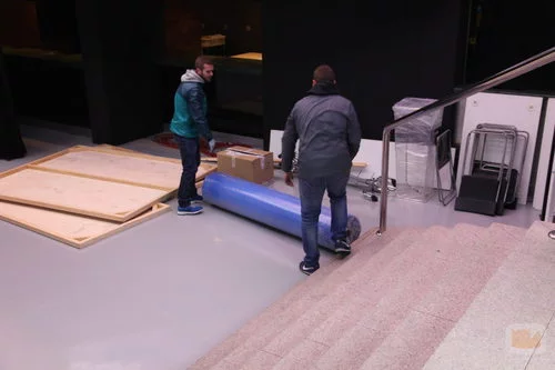 Los operarios se disponen a instalar la alfombra azul por la que el 19 de febrero desfilarán los invitados y talent del canal Discovery MAX.