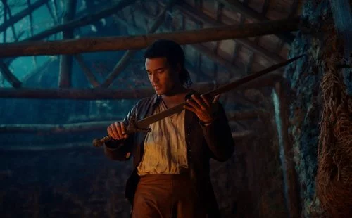 El actor californiano sostiene la espada Excálibur en 'Maldita', la revisión de la leyenda artúrica en Netflix.