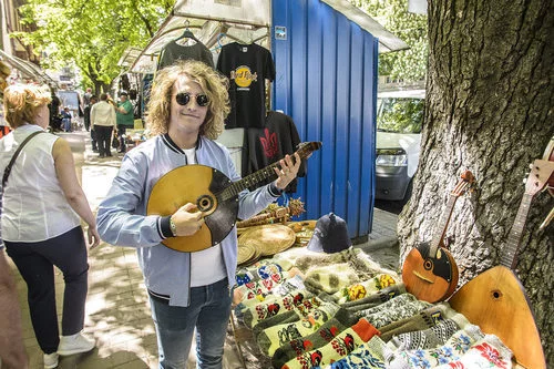 Manel Navarro posa divertido con uno de los instrumentos típicos del folclore de Kiev, Ucrania, durante su visita a la ciudad.