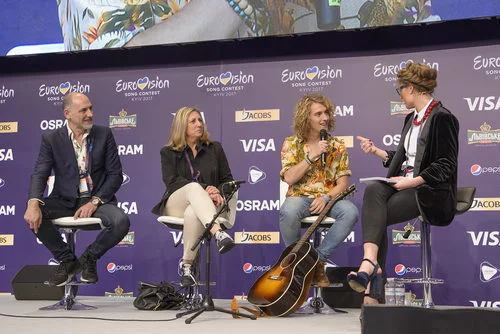 Manel Navarro durante su rueda de prensa tras el primer ensayo en el escenario de Kiev, Ucrania, en el Festival de Eurovisión.