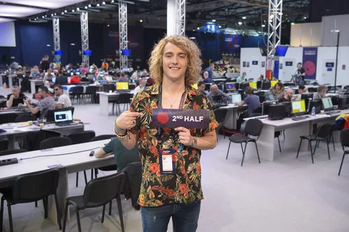 Manel Navarro con el cartel de la segunda mitad de la final de Eurovisión 2017