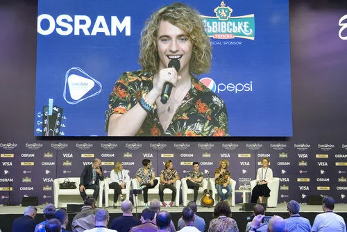Manel Navarro habla con los medios de comunicación durante la rueda de prensa celebrada después de su segundo ensayo en Kiev.