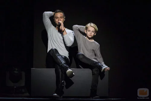 Mans Zelmerlo, ganador del Festival de Eurovisión en 2015, interpreta "Heroes" junto a un niño durante la primera semifinal del certamen de 2016.