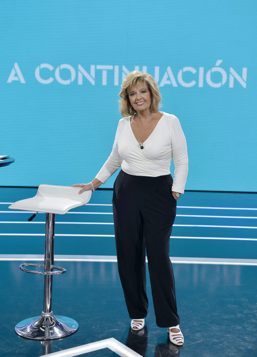 María Teresa Campos en el primer debate de 'GH Revolution' en el plató del programa de Telecinco, apoyada ligeramente en la mesa.