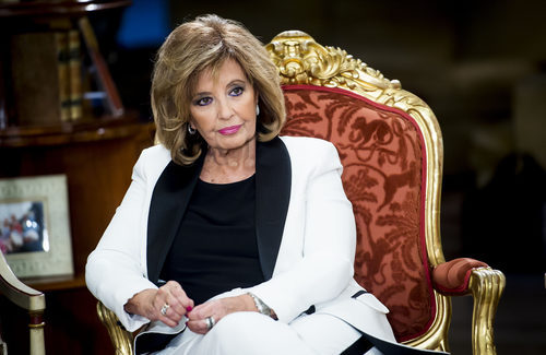 María Teresa Campos sentada en una silla en el salón de la casa de su hija Terelu durante la rueda de prensa de presentación de la tercera temporada de su docu-reality en Telecinco, 'Las Campos'.