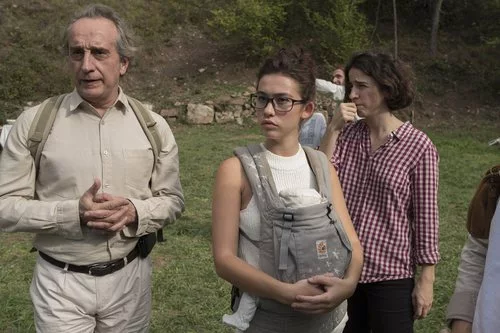 Los actores que, interpretan a Jacobo Vidal y su hija Valeria, vestidos como sus personajes en una imagen del rodaje de 'Matar al padre' junto a la directora y creadora de la ficción de Movistar+, Mar Coll.