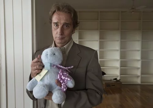 Gonzalo de Castro se transforma en este abogado autoritario que sujeta un muñeco de peluche en unas de las escenas de la primera temporada de 'Matar al padre'.