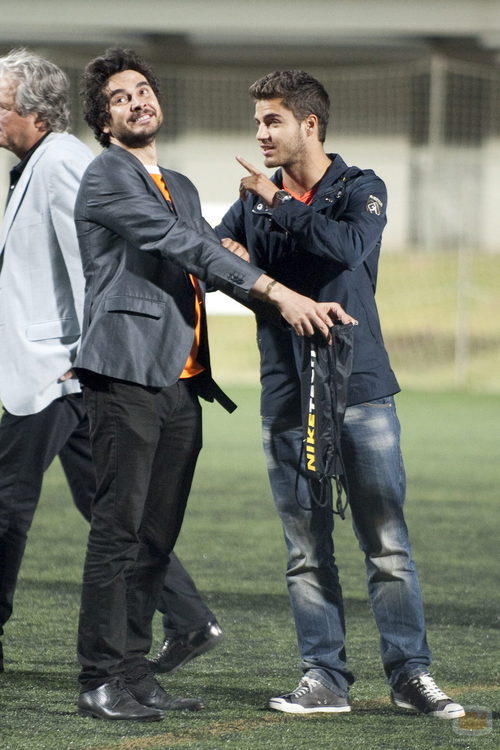 El actor Maxi Iglesias bromea sobre el campo de fútbol del partido de Fox con José Manuel Seda.