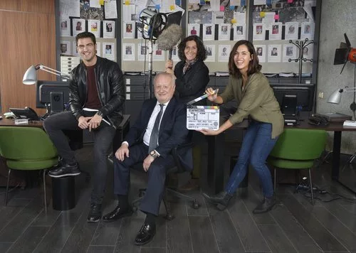 Los actores Maxi Iglesias, Juan Echanove, Elvira Mínguez y Michelle Calvó posan sonrientes en el decorado de la comisaría en que se ambienta la serie.