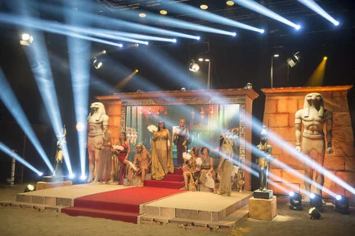 Marco Ferri, Daniela Blume, Elettra Lamborghini, Irma Soriano, Emma Ozores, Ivonne Reyes y Alyson Rae Eckmann realizan una actuación egipcia.