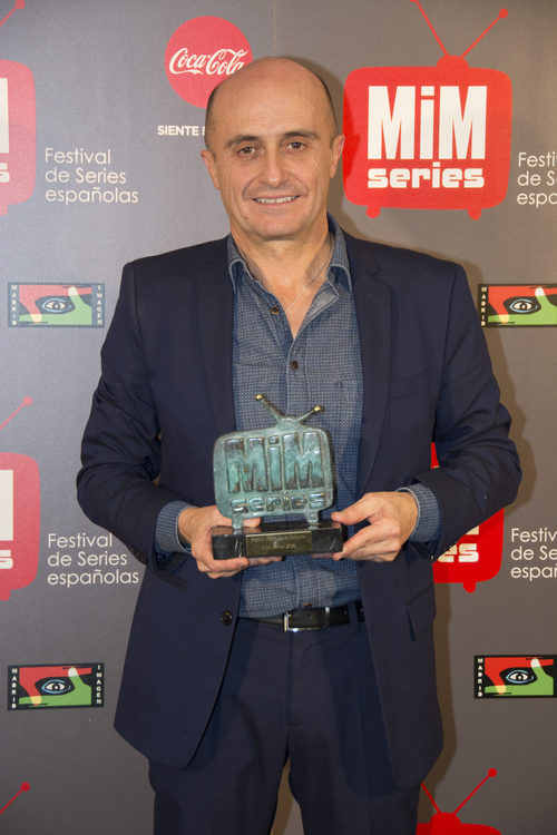 El actor y cómico Pepe Viyuela posando con su Premio MiM 2016 que le acredita como mejor actor de comedia en los Premios MiM por su papel en 'Olmos y Robles'
