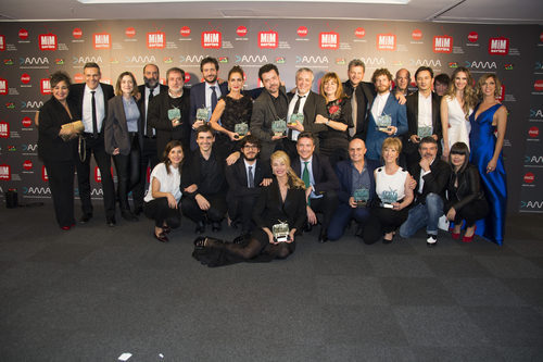 Todos los premiados, junto con Eva Isanta, presentadora de la gala, posan felices con los diferentes Premios MiM.