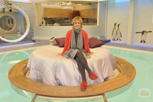 Mercedes Milá posa sentada en la cama que hay sobre la piscina de la casa de 'Gran Hermano 12+1'.