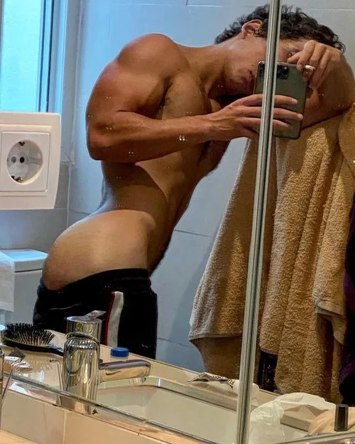 El famoso actor de 'La Casa de Papel' se hace un selfie al espejo en el cuarto de baño con los pantalones bajados.