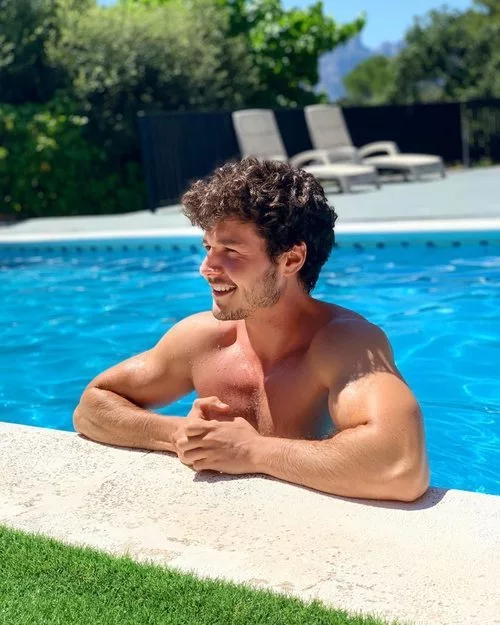 El cantante y concursante de 'Operación Triunfo 2018' muestra su musculado torso al desnudo mientras disfruta de un baño en la piscina.