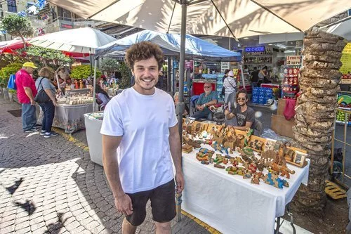El cantante Miki Núñez posa junto a un puesto de artesanía de madera en uno de los mercados más conocidos de Tel Aviv.