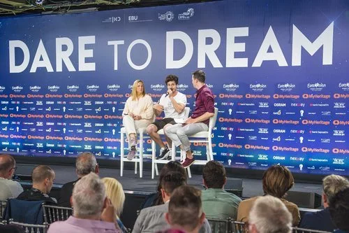 Miki Núñez celebra en Tel Aviv el primer encuentro con los medios especializados en Eurovisión tras su primer ensayo.