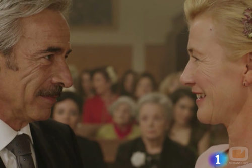 En 'Cuéntame' Mercedes (Ana Duato) y Antonio (Imanol Arias) intercambian los anillos emocionados y ante la atenta mirada de todos los amigos y familiares de San Genaro.