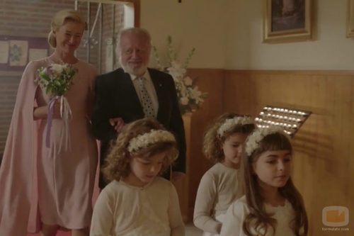 En la boda de 'Cuéntame', Mercedes Alcántara ( Ana Duato) entra en la iglesia del brazo de su cuñado Miguel Alcántara ( Juan Echanove) emocionados.