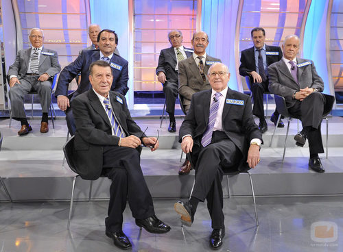 Los pretendientes de Sabina junto a Emma García en 'Mujeres y Hombres Oro' de Telecinco.