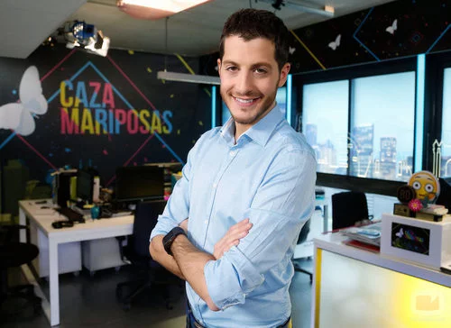 Nando Escribano, uno de los presentadores de 'Cazamariposas', posa sonriente y muy firme en la redacción del informativo de celebrities y tendencias