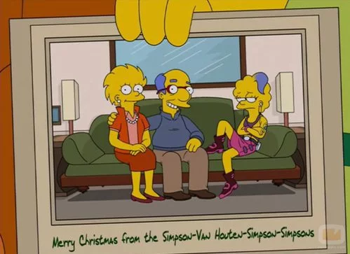 La familia de Lisa dentro de 30 años. Compuesta por Lisa que tiene 38 años, Milhouse Van Houte que tiene 40 años y Zia Simpson, 14.