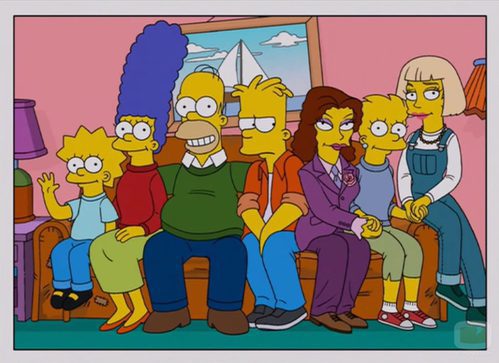 Los Simpson 12 años más tarde. Maggie tiene 13 años, Marge tiene 49 años, Homer tiene 51 años, Bart tiene 22 y Lisa tiene 20. Lisa aparece con dos novias.