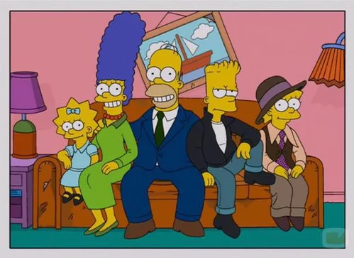 Los Simpson 6 años más tarde. Maggie tiene 7 años, Marge tiene 43 años, Homer tiene 45 años, Bart tiene 16 y Lisa tiene 14. Bart va vestido como años 80 y Lisa de Annie Hall.
