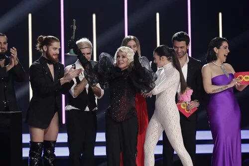 Blanca Paloma le entrega el micrófono de cristal a Nebulossa después de que Ruth Lorenzo y Marc Calderó la proclamaran vencedora del certamen y representantes de España en Eurovisión 2024.