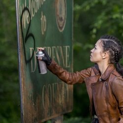 Rosita escribe encima del cartel de un pueblo en 'The Walking Dead'