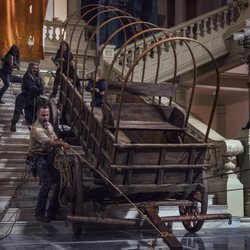 Los supervivientes de 'The Walking Dead' intentan mover un pesado carro por unas escaleras