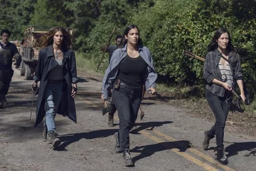 Los personajes interpretados por Nadia Hilker, Alanna Masterson y Eleanor Matsuura lidera una nueva caravana de suministros en esta imagen de la segunda parte de la novena temporada.