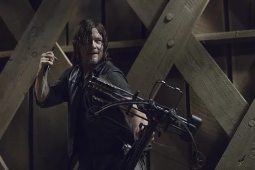 Imagen de la segunda mitad de la novena temporada de la serie de AMC en la que el cazador blande su clásica ballesta.