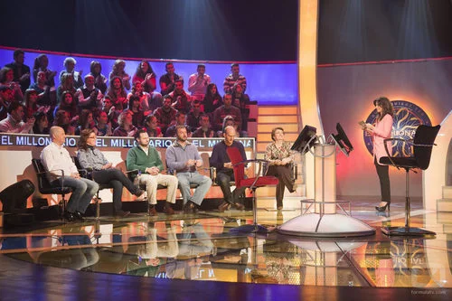 La presentadora formula la pregunta de clasificación a los seis participantes con los que cuenta el concurso.