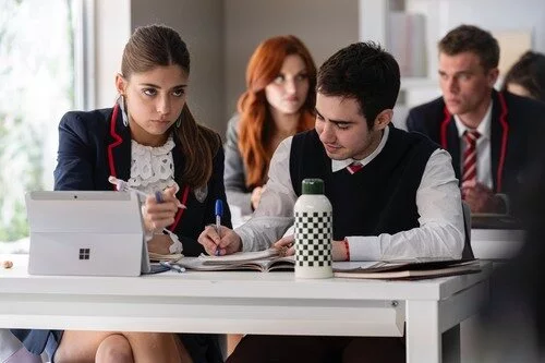 Fotografía de la octava temporada de 'Élite', la temporada final de la serie de Netflix, en las que aparecen Sara (Carmen Arrufat) sentada junto a Nicolás (Ander Puig) en la clase de Las Encinas.