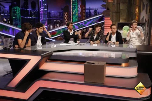 Louis Tomlinson, Niall Horan, Harry Styles, Zayn Malik y Liam Payne, de One Direction, junto a Pablo Motos durante la visita del grupo a 'El Hormiguero'.